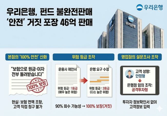 우리은행이 위험 등급을 인위적으로 낮추고 안전성을 과장해 펀드 46억 원어치를 판 사실이 드러났다.