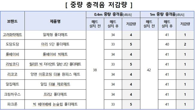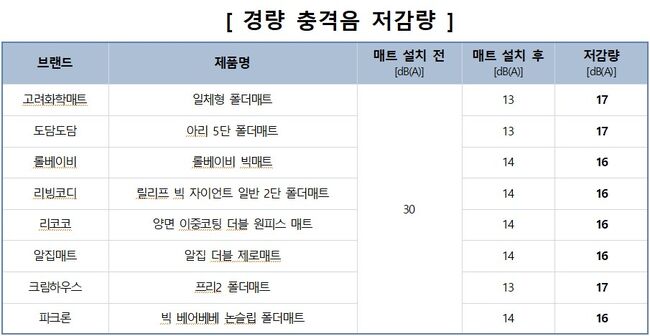 한국소비자원 층간소음 매트 조사중량 충격음 저감량