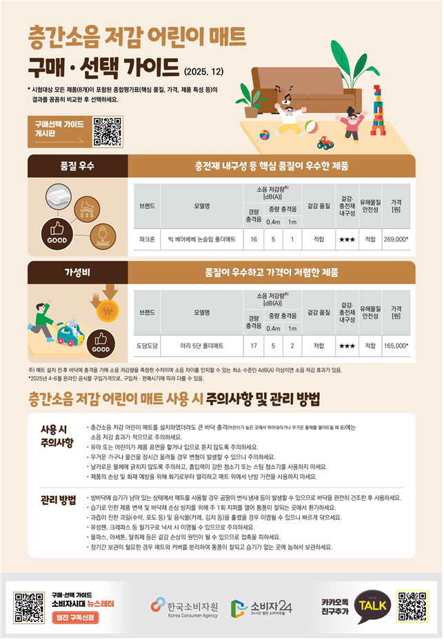 한국소비자원이 소비자 선호도가 높은 8개 브랜드의 폴더형 매트(두께 4cm)를 시험한 결과, 소음 차단 성능은 제품별로 큰 차이가 없었으나 내구성과 안전성에서는 희비가 엇갈리는 것으로 나타났다.
