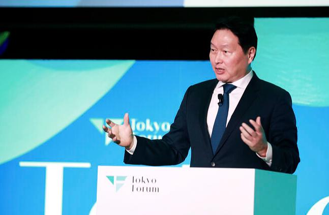 회장이 21일 일본 도쿄대 야스다 강당에서 '도쿄포럼2025' 개회사를 하고 있다. SK그룹이 올해 창사 이래 최대 수출 실적을 갈아치울 태세다. AI 시대 '산업의 쌀'로 불리는 고대역폭메모리(HBM)가 날개 돋친 듯 팔려나가며 그룹 전체 수출을 120조 원대까지 끌어올렸다. SK는 25일 3분기까지 수출액은 87조8000억 원으로 지난해 같은 기간.