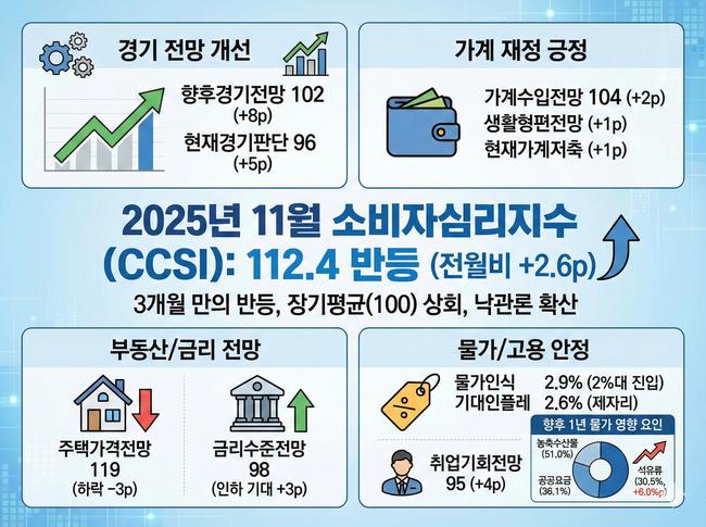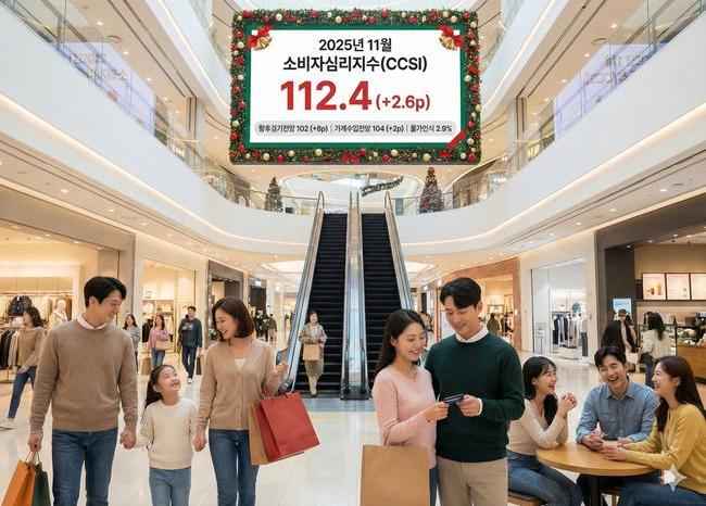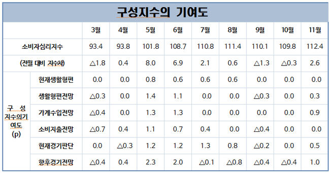 11월 소비자심리지수(CCSI)가 112.4를 기록하며 전월 대비 2.6포인트 상승했다.