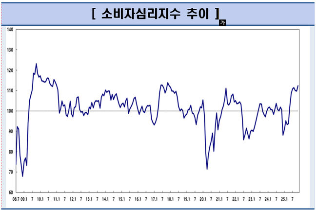 한국은행이 25일 발표한 '2025년 11월 소비자동향조사 결과'에 따른 결과다. 112.4는 장기평균치(2003년~2024년) 100을 훌쩍 넘는 수치로, 소비자들이 평균보다 낙관적으로 보고 있다는 것이다.