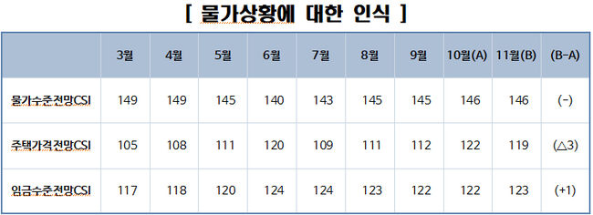 주택시장에 대한 기대감은 다소 꺾였다. 주택가격전망CSI는 119로 전월 대비 3포인트 하락했다. 10월 122까지 치솟았던 집값 상승 기대심리가 한풀 꺾인 모양새다.