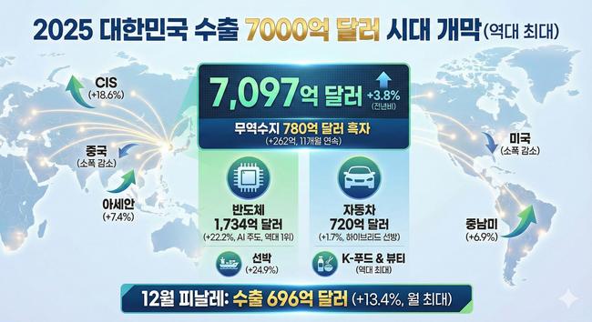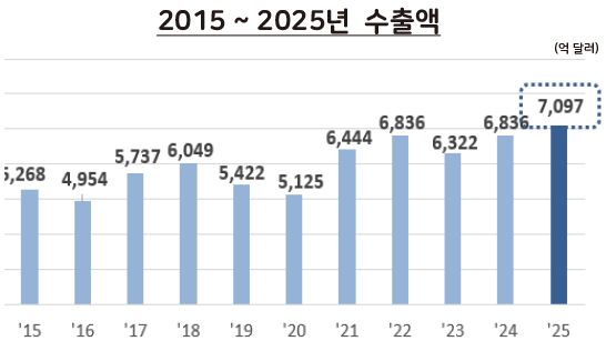 대한민국 수출이 AI 열풍을 타고 7000억 달러 벽을 넘으며 역대 최대 실적을 거뒀다. 2025년 연간 수출액이 전년 대비 3.8% 증가한 7097억 달러를 기록한 것이다.