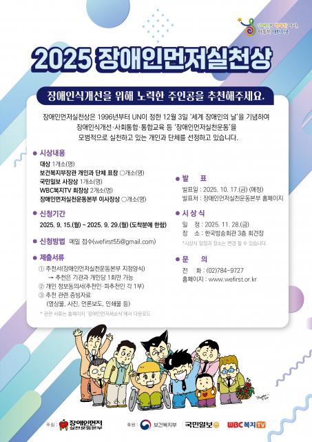 장애인먼저실천운동본부가 9월 15일~29일 '2025 장애인먼저실천상' 후보를 접수한다. 개인, 공공기관, 단체, 기업 등 다양한 후보가 참여할 수 있다.