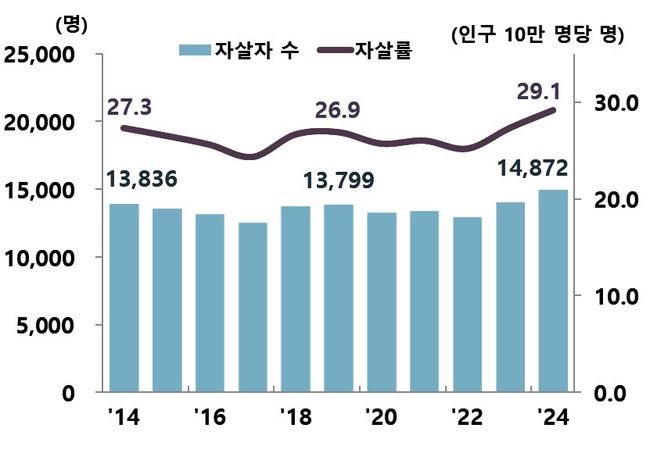 지난해 국내 자살자 수가 1만4,872명이나 됐다. 전년 대비 894명(6.4%)이 늘었으며, 하루 평균 40.6명이 스스로 생을 마감했다. 2011년 이후 최고치로, 인구 10만 명당 자살률은 29.1명이었다.
