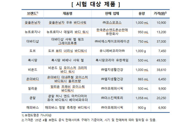한국소비자원이 14일 소비자 선호도가 높은 바디워시 10개 제품의 품질을 비교·평가한 결과를 발표했다. 세정력과 만족도 등에서 제품별 차이가 있었다.