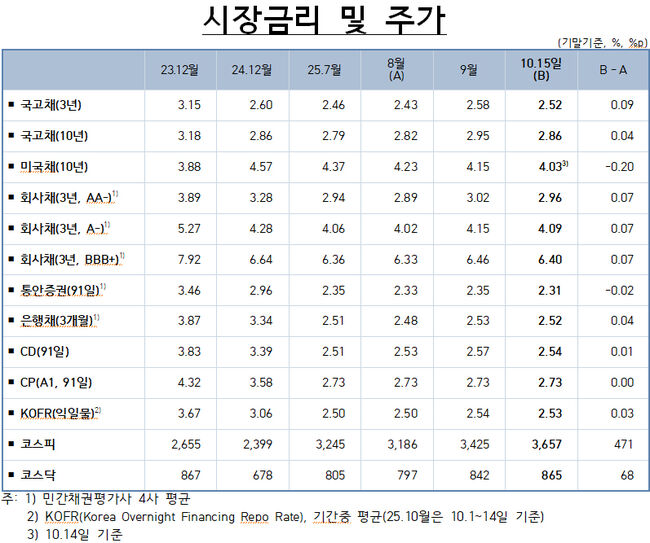 국고채 3년물 금리는 9월 말 기준 2.58%로, 전월(2.43%) 대비 0.09%p 상승했다. 9월 하순 이후 금융안정 리스크가 커지고 외국인이 국채선물을 순매도한 영향이다.