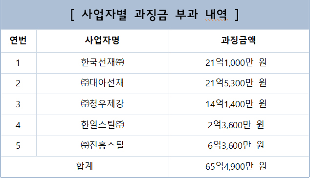 대아선재 21억5,300만 원, 한국선재 21억1,000만 원, 청우제강 14억1,400만 원, 진흥스틸 6억3,600만 원, 한일스틸 2억3,600만 원 순이다.