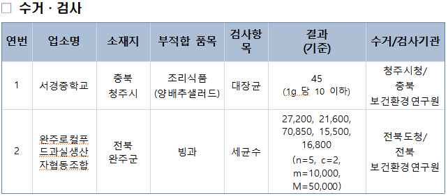 충북 청주시 서경중 '양배추 샐러드'에서는 대장균이 기준치(10 이하/g)를 4.5배 초과한 45가 검출됐다.