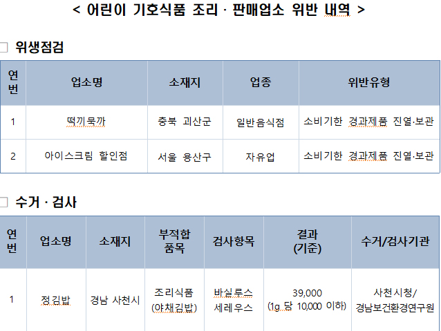 • - 15곳서 소비기한 경과, 대장균, 식중독균 검출