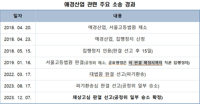 애경산업은 2023년 12월 7일 대법원 판결로 패소가 확정돼, 2024년 1월 6일까지 공표명령을 이행해야 했다.
