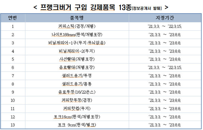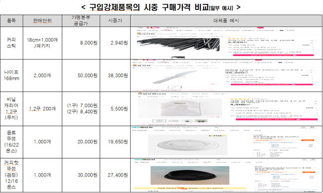 가맹점주를 향한 '쥐어짜기'도 드러났다. 프랭크에프앤비는 2021년 3월~2023년 8월 포크, 나이프, 커피 스틱, 샐러드 용기 등 13개 품목을 '구입강제품목'으로 지정했다.