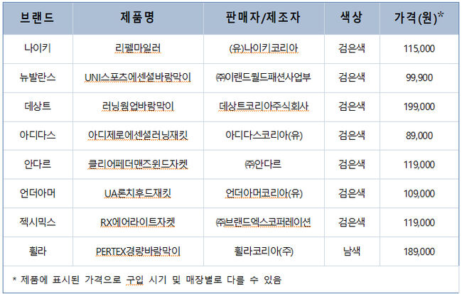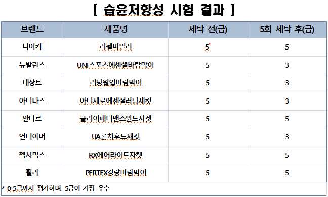 반면, 나이키(리펠마일러), 안다르(클리어페더맨즈윈드자켓), 젝시믹스(RX에어라이트자켓), 휠라(PERTEX경량바람막이) 4개 제품은 5급을 유지하며 '세탁 내구성'을 입증했다.