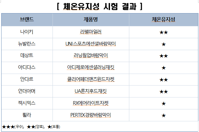 바람이 부는 환경(1.8m/s)에서 체온을 잘 유지하는 '체온유지성'은 나이키, 데상트, 안다르, 언더아머의 4개 제품이 상대적으로 '양호(★★)' 평가를 받았다.