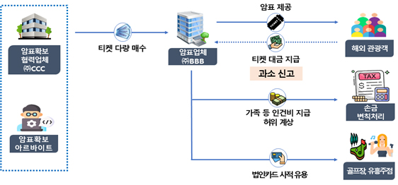 해외 관광객을 상대로 암표를 판 B업체는 100명이 넘는 티켓팅 아르바이트까지 고용해 100억 원에 달하는 수입을 누락하고, 대표 가족에게 허위 인건비를 지급하거나 법인카드로 유흥주점과 골프장을 드나들었다.