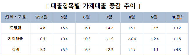 문제는 기타대출이었다. 9월 5,000억 원 감소했던 기타대출은 10월 1조4,000억 원 증가로 돌아섰다. 국내외 주식 투자 확대, '10.15 대책'을 앞둔 주택거래 선수요, 장기 추석연휴 등에 따라 자금 수요가 맞물리며 신용대출이 급증한 탓이다.