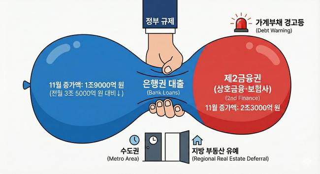 2025년의 끝자락, 정부의 강력한 대출 조이기 정책이 통계로 확인됐다. 은행 문턱을 넘지 못한 서민들이 상호금융과 보험사로 몰려가는 이른바 '풍선효과'가 현실화되면서 가계부채 관리에 경고등이 커진 것이다.