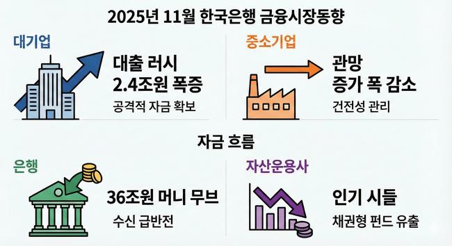 기업들은 연말을 앞두고 곳간을 채우기 위해 6조 원이 넘는 돈을 빌리며 대출 창구를 뜨겁게 달궜다. 한국은행이 10일 발표한 '2025년 11월 중 금융시장 동향'을 통해 자금의 흐름을 분석했다.