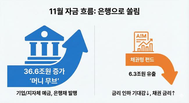 11월엔 은행으로 36조 원이 쏠렸고, 채권형 펀드는 6.3조 원이 빠져나갔다