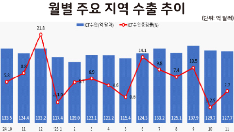 [정보통신 수출입동향] 2025년 11월, ICT 수출이 전년 동월 대비 24.3%나 증가한 254.5억 달러를 기록했다.