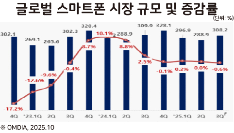 글로벌 스마트폰 시장 규모 및 증감률(%)