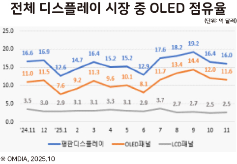 디스플레이 부문은 희비가 엇갈렸다. 전체 수출은 16.0억 달러로 3.7% 감소했다. 스마트폰 신제품 출시 효과와 IT 기기의 OLED 채택 확대로 OLED 수출은 5.9% 늘어난 11.6억 달러를 기록하며 선방했다.