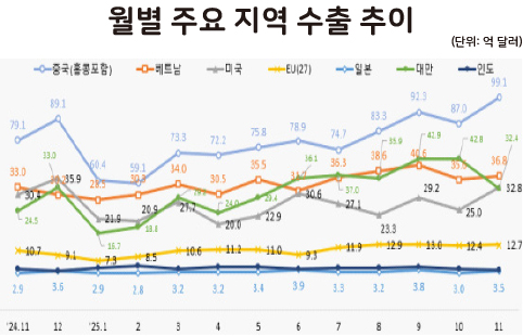 지역별로 보면 중국의 존재감이 여전했다. 홍콩을 포함한 대중국 수출은 99.1억 달러로 25.3% 증가하며 4개월 연속 상승세를 탔다. 반도체(31.8%↑)와 휴대폰(19.8%↑)이 중국 수출을 쌍끌이했다.