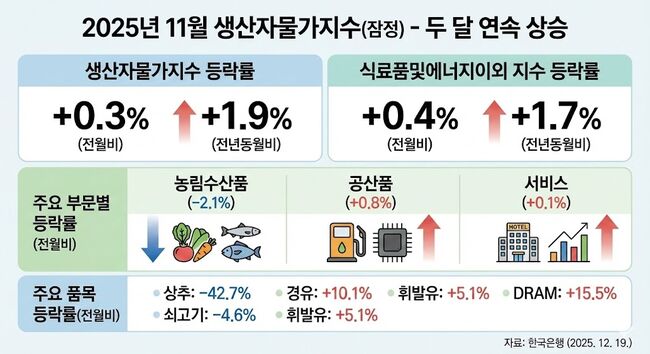 한국은행이 19일 발표한 '2025년 11월 생산자물가지수(잠정)'에 따르면, 11월 생산자물가지수는 전월 대비 0.3% 상승했다. 10월(0.4%)에 이어 두 달 연속 상승 흐름이다. 전년 동월과 비교하면 1.9% 올라, 산업 전반의 비용 압력이 여전함을 시사했다.