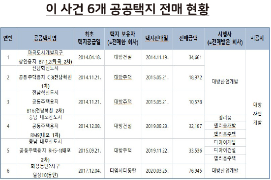 2014 ~ 2017년 공동주택용지 6곳(마곡2차, 전남혁신 1·2차, 내포 1·2차, 화성동탄2)을 확보한 대방건설은 2014년 11월 ~ 2020년 3월 낙찰 받은 땅에 건물을 짓는 대신 프리미엄 없이 그대로 대방산업개발과 그 자회사 5곳(엘리움·엘리움개발·엘리움주택·디아이개발·디아이건설로 모두 대방산업개발이 지분 100%를 보유하고 있다)에 공급가 그대로 넘겼다.