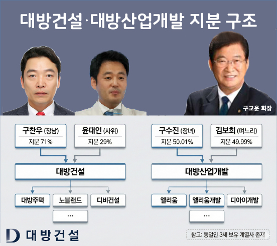 대방건설은 구 회장의 장남 구찬우(대방건설 최대주주, 71%) 대표가 이끌고 있으며, 동생 구수진(대방산업개발 최대주주, 50.01%)은 남편 윤대인 대표를 앞세워 대방산업개발을 이끌고 있다.