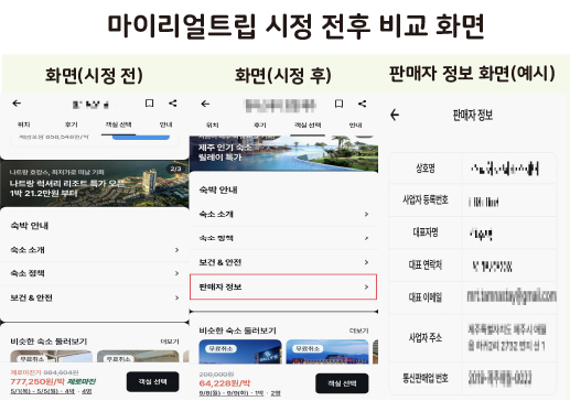마이리얼트립의 판매자 정보 부재 화면 및 공정위 제재 후 시정 화면
