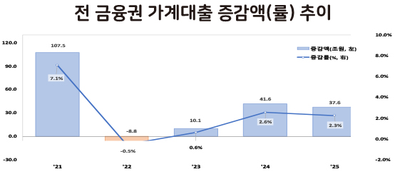 금융위원회 발표 '2025년 가계대출 동향(잠정)' 전 금융권 가계대출 증감액(률) 추이