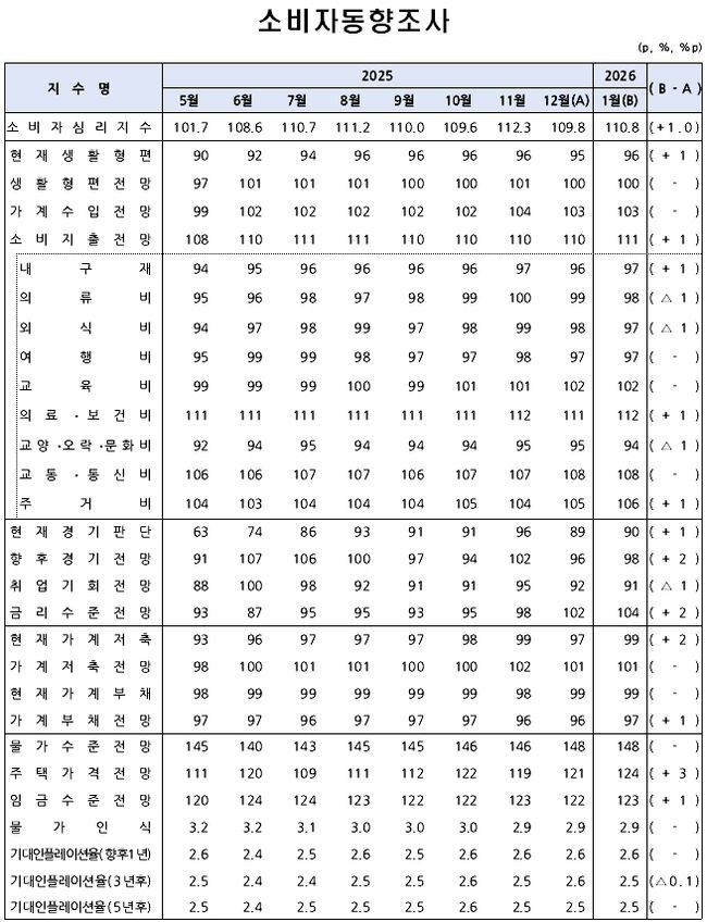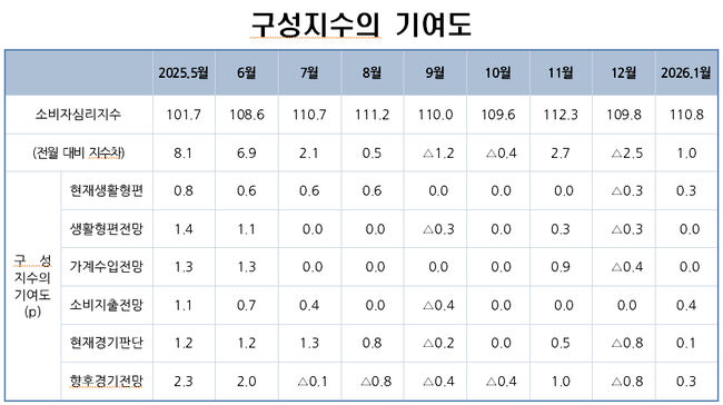 2026년 새해, 소비 심리가 조금씩 녹아내리고 있다. 한국은행이 발표한 1월 소비자심리지수(CCSI)는 110.8을 기록한 것이다.