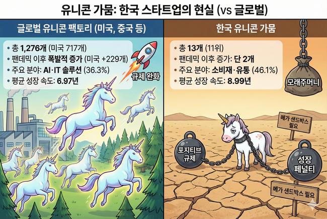 같은 기간 한국 땅에서 새로 탄생한 유니콘기업은 단 2개뿐이었다. 글로벌 스타트업 시장이 팬데믹 이후 폭발적으로 성장하는 동안, 한국의 '유니콘 농장'에는 가뭄이 들었다.