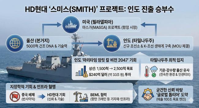 미국 함정 시장을 겨냥한 '마스가(MASGA)' 프로젝트에 이어, 이번에는 세계 최대 잠재 시장인 인도를 공략하는 '스미스(SMITH)' 프로젝트다.