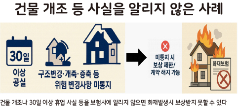 보험 계약 후 건물을 증축·개축하거나 15일 이상 대수선하는 경우, 혹은 30일 이상 건물을 비워두는(휴업) 경우에는 반드시 보험사에 알려야 한다.