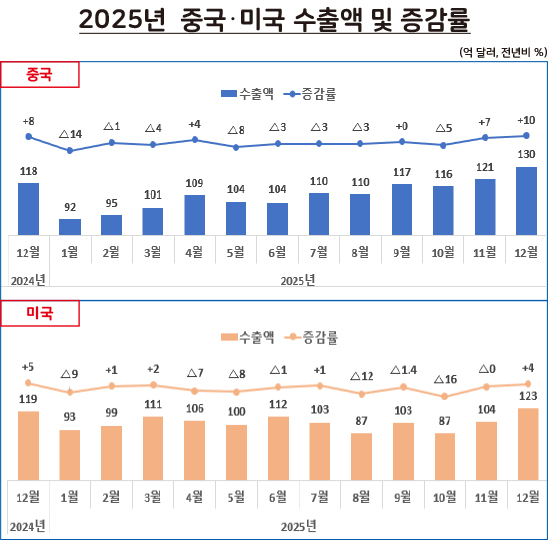 2025년 중국·미국 수출액 및 증감률