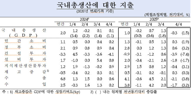 [한국은행 국내총생산] 2025년 GDP 1% 턱걸이 상승…4분기는 0.3% 감소