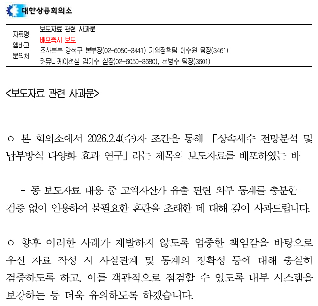 대한상공회의소의 '가짜뉴스' 유포 관련 사과문