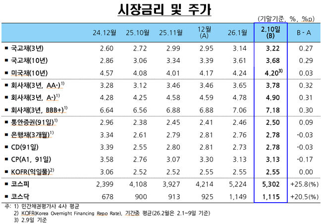 금리시장도 들썩였다. 국고채 3년물 금리는 지난해 말 2.95%에서 2월 10일 기준 3.22%로 0.27%p 상승했고 10년물 금리 역시 3.39%에서 3.68%로 올랐다.