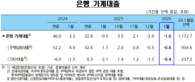 은행들의 대출 관리 지속과 전세 자금 수요 둔화가 겹친 결과다. 신용대출 등 기타대출 역시 연초 상여금 유입 등으로 0.4조 원 줄었다. 다만 주식 투자 자금 수요 등으로 감소 폭은 전월(-1.5조 원)보다 축소됐다.