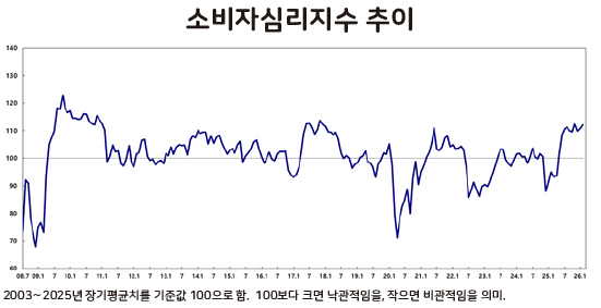 한국은행이 24일 발표한 '2026년 2월 소비자동향조사 결과'에 따르면 소비자심리지수(CCSI)는 112.1을 기록했다. 1월 110.8에서 1.3p 상승한 수치다.