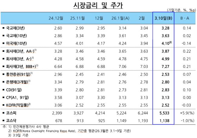 채권시장도 외부 충격파를 피하지 못했다국고채 금리는 2월 중순 이후 미 연준의 금리 인하 기대가 커지며 상당 폭 하락했고, 3월에 접어들며 중동 상황 장기화 우려와 국제 유가 상승세가 겹쳐 다시 큰 폭으로 뛰어올랐다주요 단기 시장금리 역시 통화정책 기대 변화와 수급 부담이 맞물려 오름세를 보였다.