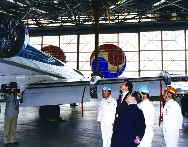 격납고 점검하는 한진그룹 조중훈 창업회장과 조양호 선대회장(왼쪽). [대한항공 제공]