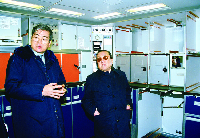 기내 점검하는 한진그룹 조중훈 창업회장과 조양호 선대회장(왼쪽). [대한항공 제공]