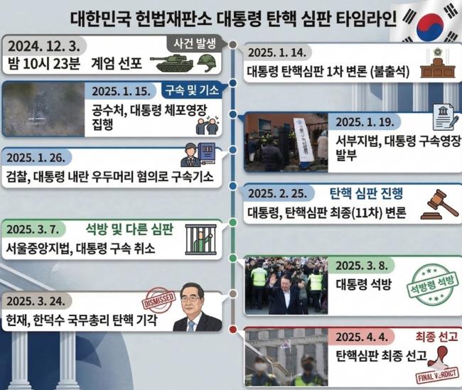 2월 25일 최종 변론을 마친 헌재는 주말을 빼고 매일 평의를 열었지만 고심은 예상보다 길어졌다. 특히 3월 8일 윤 대통령이 구속 취소로 석방되면서 재판관 내부의 5대 3 갈등설 등 온갖 억측이 여론의 불안을 자극했다. 결국 이번 사건은 노무현, 박근혜 전 대통령을 넘어 최장기 심리로 남았다.