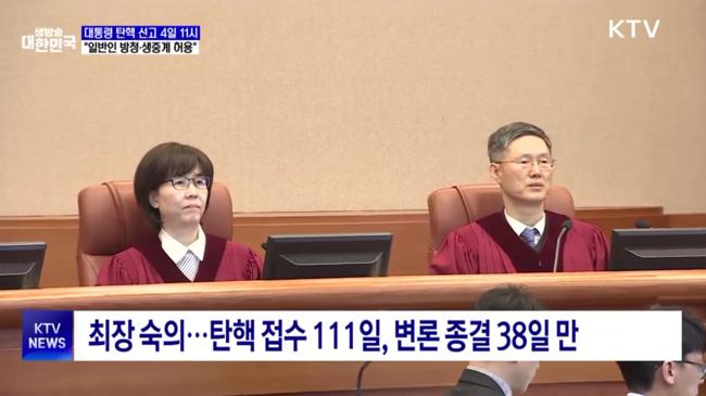 헌법재판소가 윤석열 대통령의 탄핵심판 사건 선고를 4월 4일 오전 11시 대심판정에서 진행하기로 했다(KTV 캡처)