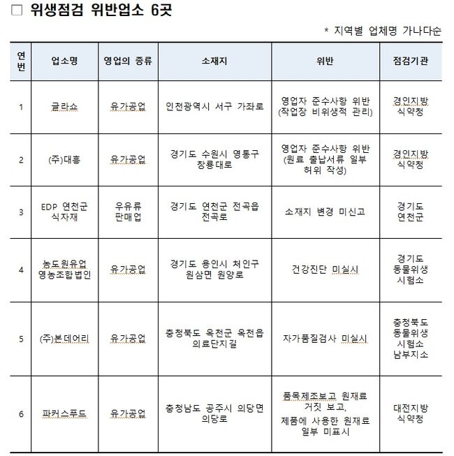 식품의약품안전처가 전국 846개 유가공업체와 판매업체를 점검해 한 결과 「축산물 위생관리법」 위반 업체 6곳을 적발했다. 별도 검사에서 대장균군 초과 검출과 성분 미달 제품 11건도 확인해 유통 차단 및 폐기 조치를 내렸다.