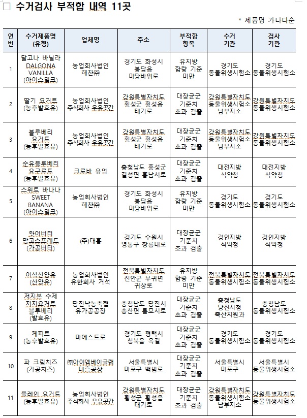 유통 중인 유가공품 642건을 수거해 살모넬라, 잔류물질, 영양성분 함량 등을 검사한 결과, 대장균군이 초과 검출된 제품 8건(농후발효유 5건, 발효유 1건, 가공치즈 1건, 가공버터 1건)과 유지방 함량이 표시 기준에 못 미친 제품 3건(아이스밀크 2건, 산양유 1건)이 적발됐다. 해당 제품들은 즉시 유통 차단 및 전량 폐기 조치됐다.